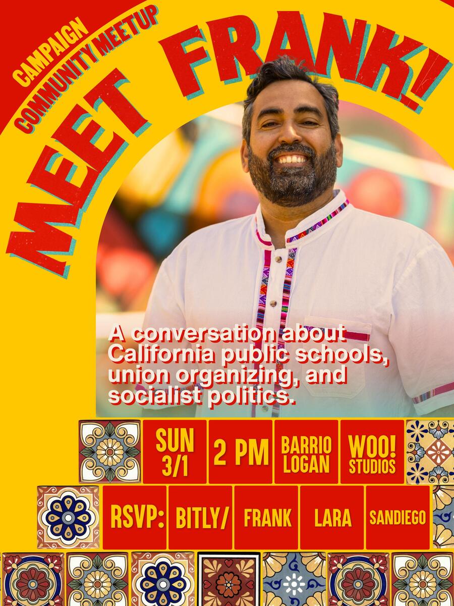On Sunday, March 1st, I'll be visiting Barrio Logan to share about my campaign for State Superintendent of Public Schools. I am a longtime union leader, socialist organizer, and deeply committed to fighting for the schools our students deserve. My campaign platform holds at its core the idea that California must be governed for the people, not for the billionaires. We want to see working people in power, meeting the needs of our families, students, and educators.